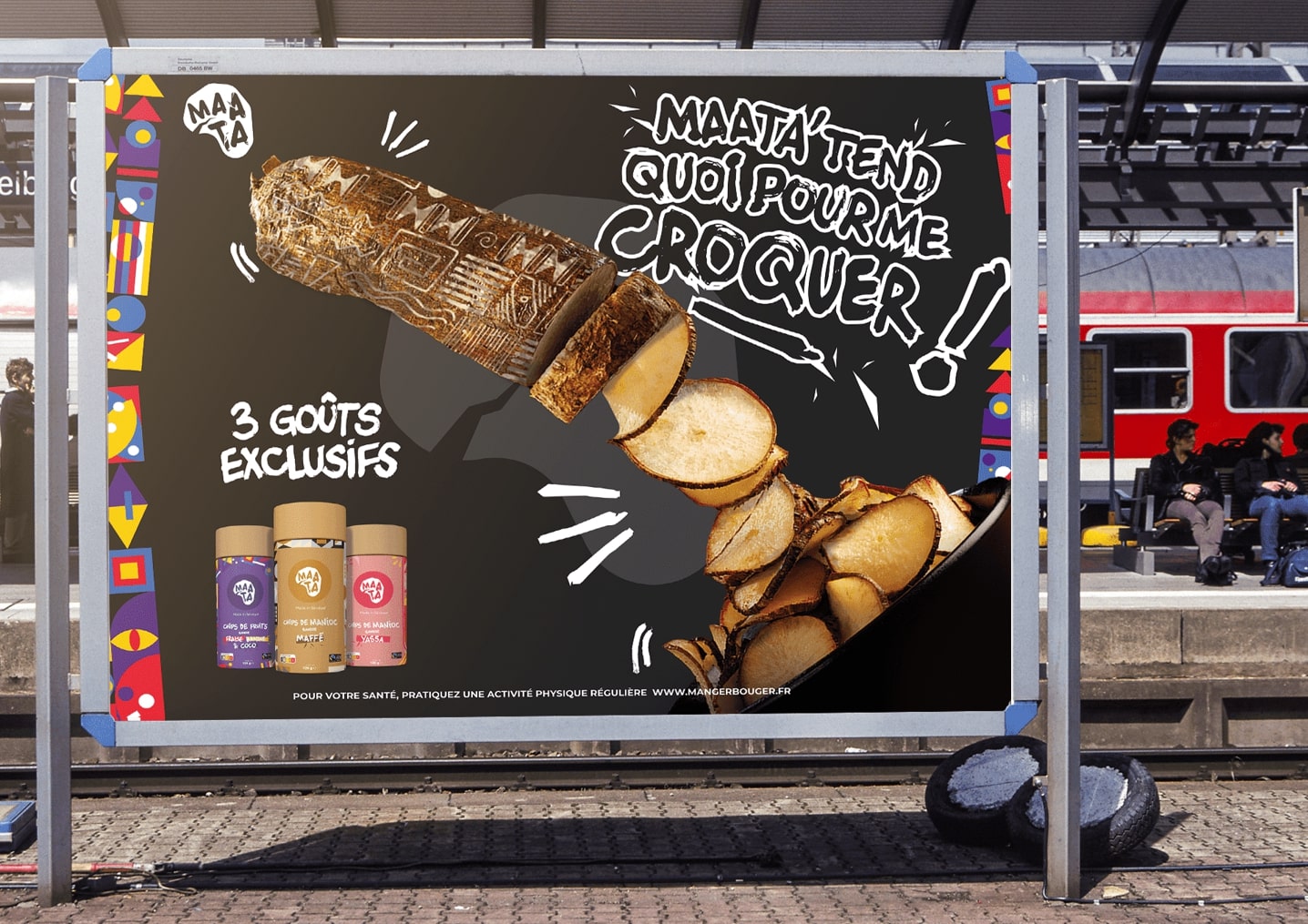 Les chips Maata sont des chips sénégalaises au Manioc. Un jeu concours basé sur un filtre instagram accompagne le lancement du produit. Création du concept, packaging, identité visuelle, affiches publicitaires, site web, filtre instagram.