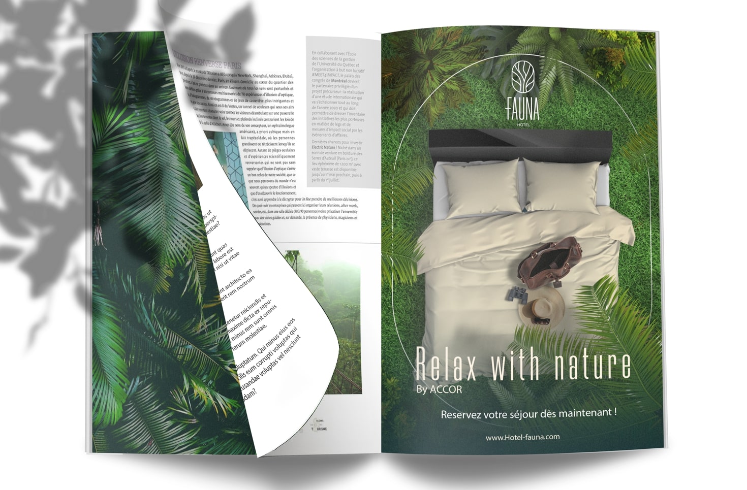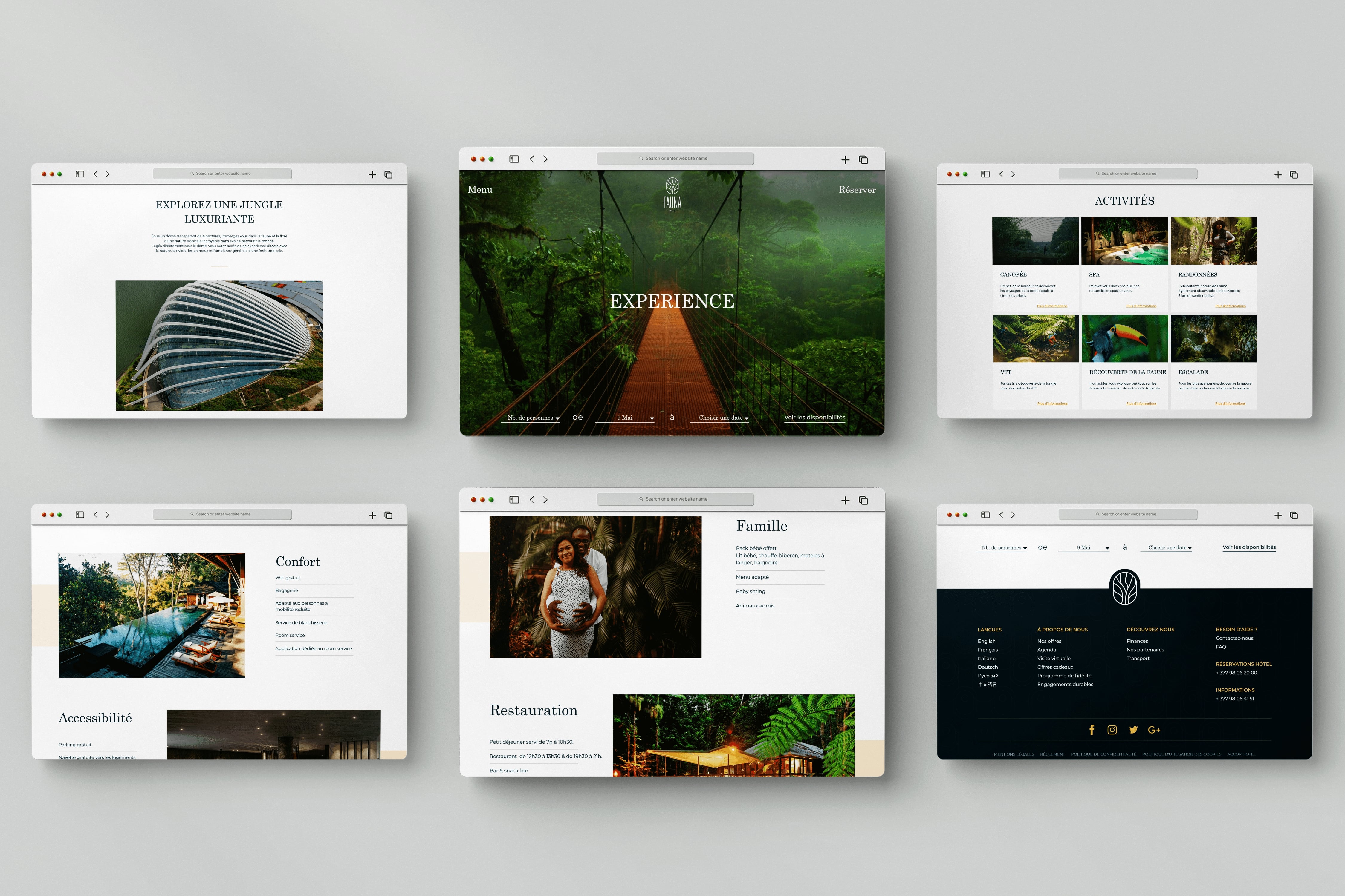 Fauna est un projet de serre tropicale de quatre hectares. Ce concept est matérialisé par un énorme dôme, les chambres sont en immersion avec la nature. Création du concept, identité visuelle, communication print et web, application de room service et site de réservation.