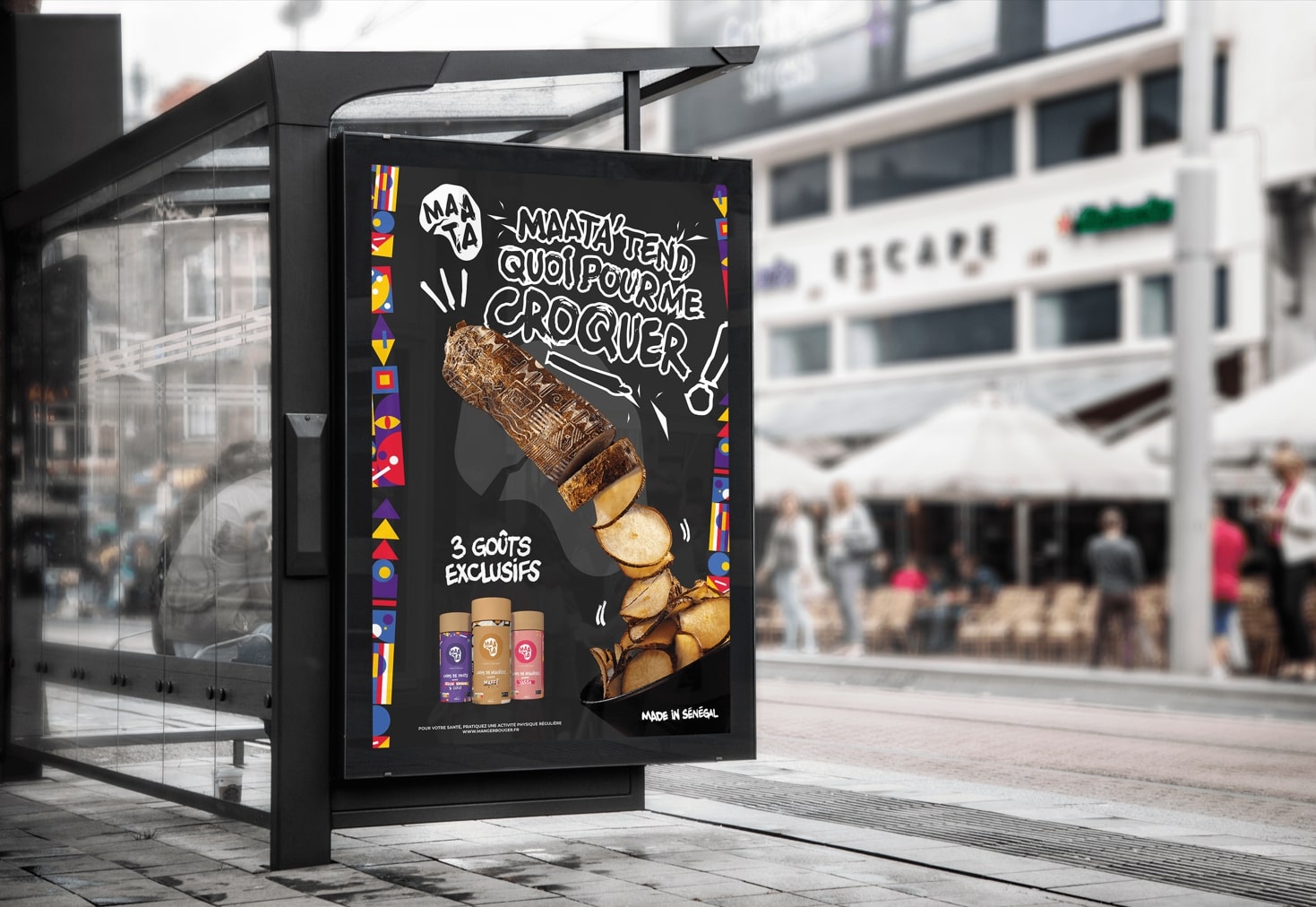 Les chips Maata sont des chips sénégalaises au Manioc. Un jeu concours basé sur un filtre instagram accompagne le lancement du produit. Création du concept, packaging, identité visuelle, affiches publicitaires, site web, filtre instagram.