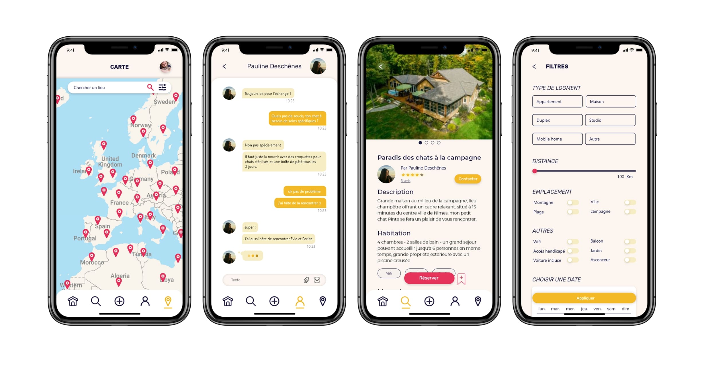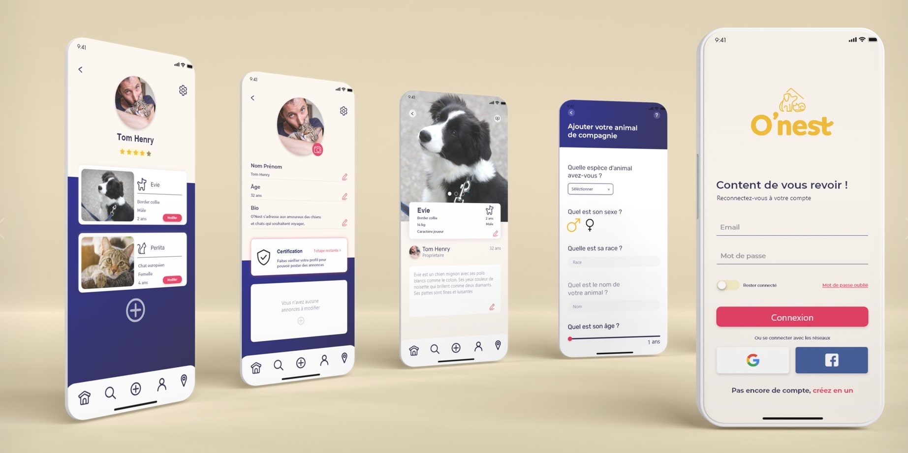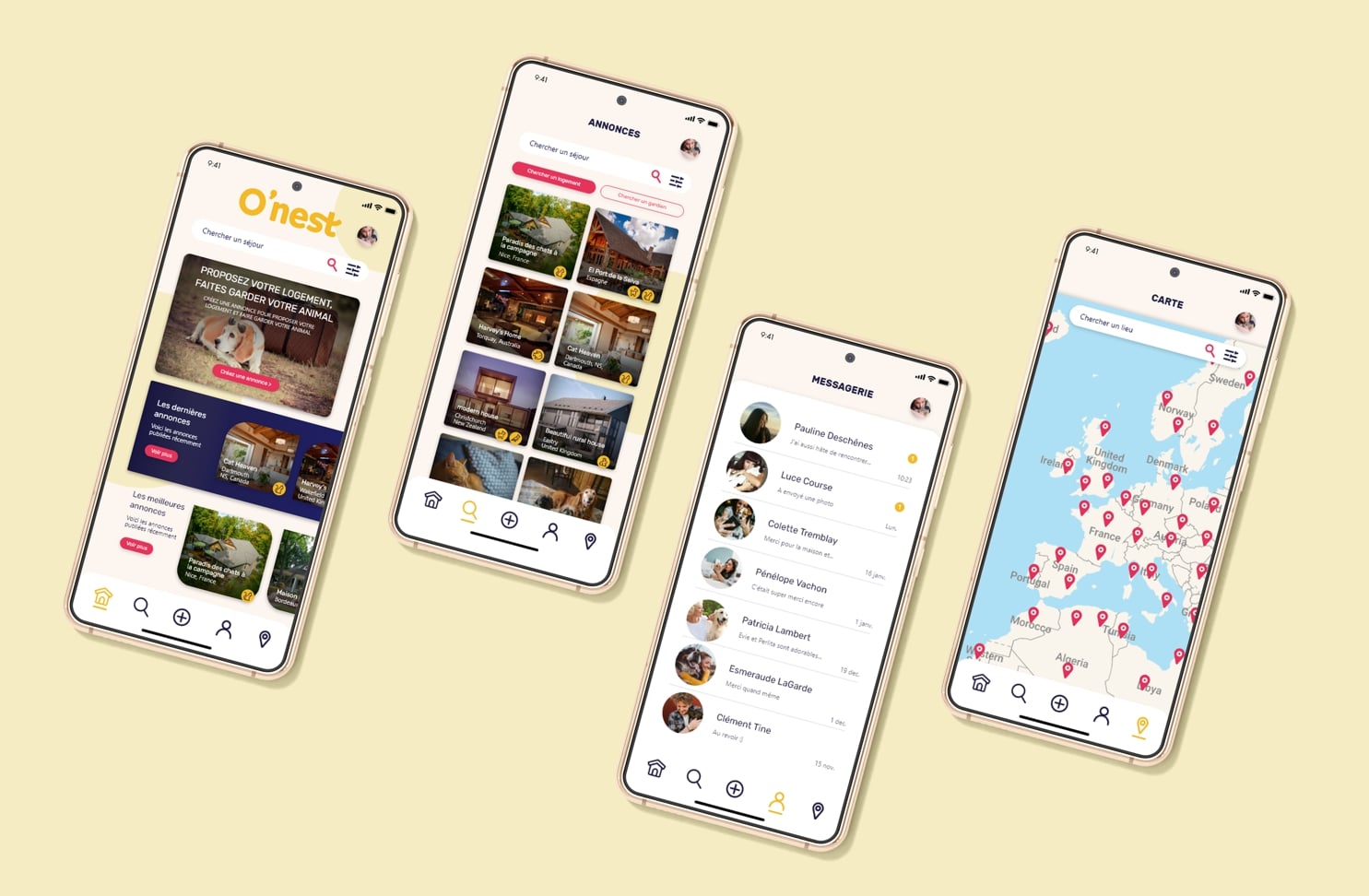 O'Nest est un service similaire à Air Bnb, où l'hôte s'occupe de l'animal du propriétaire en échange de la location. Charte graphique, design de l'application, prototypage, landing page.